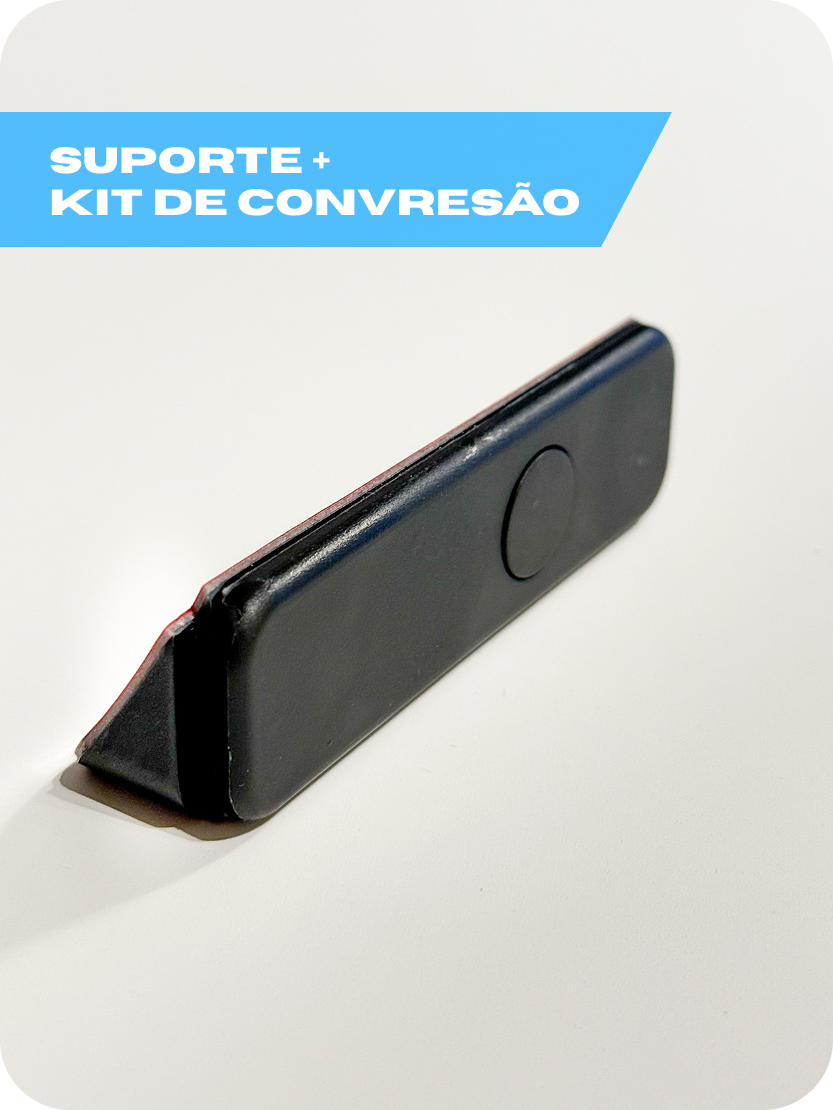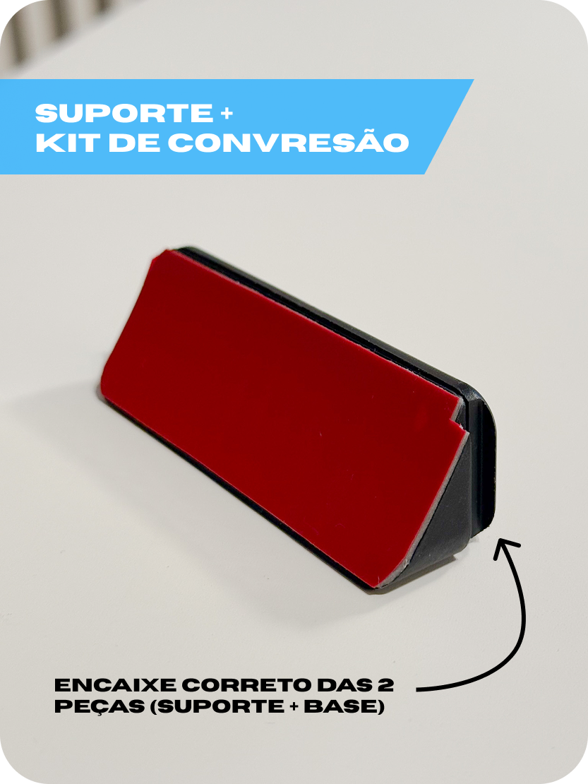 Antes de começar a instalação é preciso realizar a montagem do Suporte. Para isso cole a peça do Suporte que possui a fita azul com a mensagem "Cole no carro" jutamente ao Kit de Conversão. O Suporte e o Kit de Conversão possuem o mesmo formato, logo deve se ter o cuidado para que seja colado da maneira correta. Olhe a imagem a baixo: